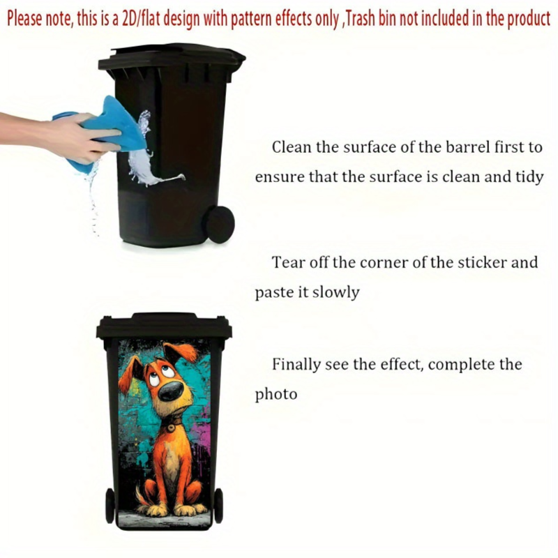 The sticker showcases an endearing cartoon dog character with orange fur against an artistic grunge-style background featuring turquoise and purple tones. The design creates a street art aesthetic that can transform ordinary trash bins into eye-catching decorative pieces. Please note that this is a sticker only – the trash bin shown in the image is not included with the product.