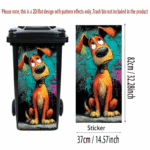 A vibrant decorative sticker designed for trash cans featuring a whimsical cartoon dog illustration against a turquoise and purple background. This 2D flat design measures 37×82 cm and is perfect for adding personality to outdoor bins, walls, or kitchen spaces.