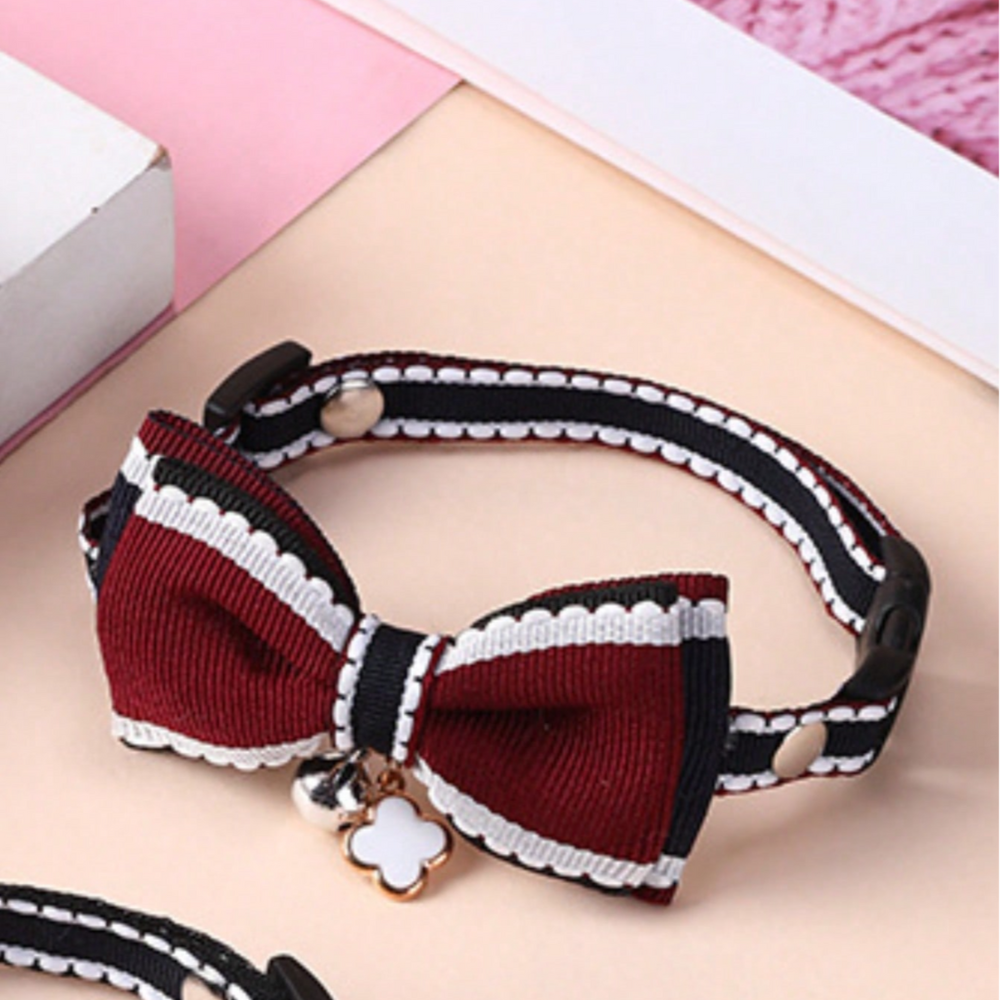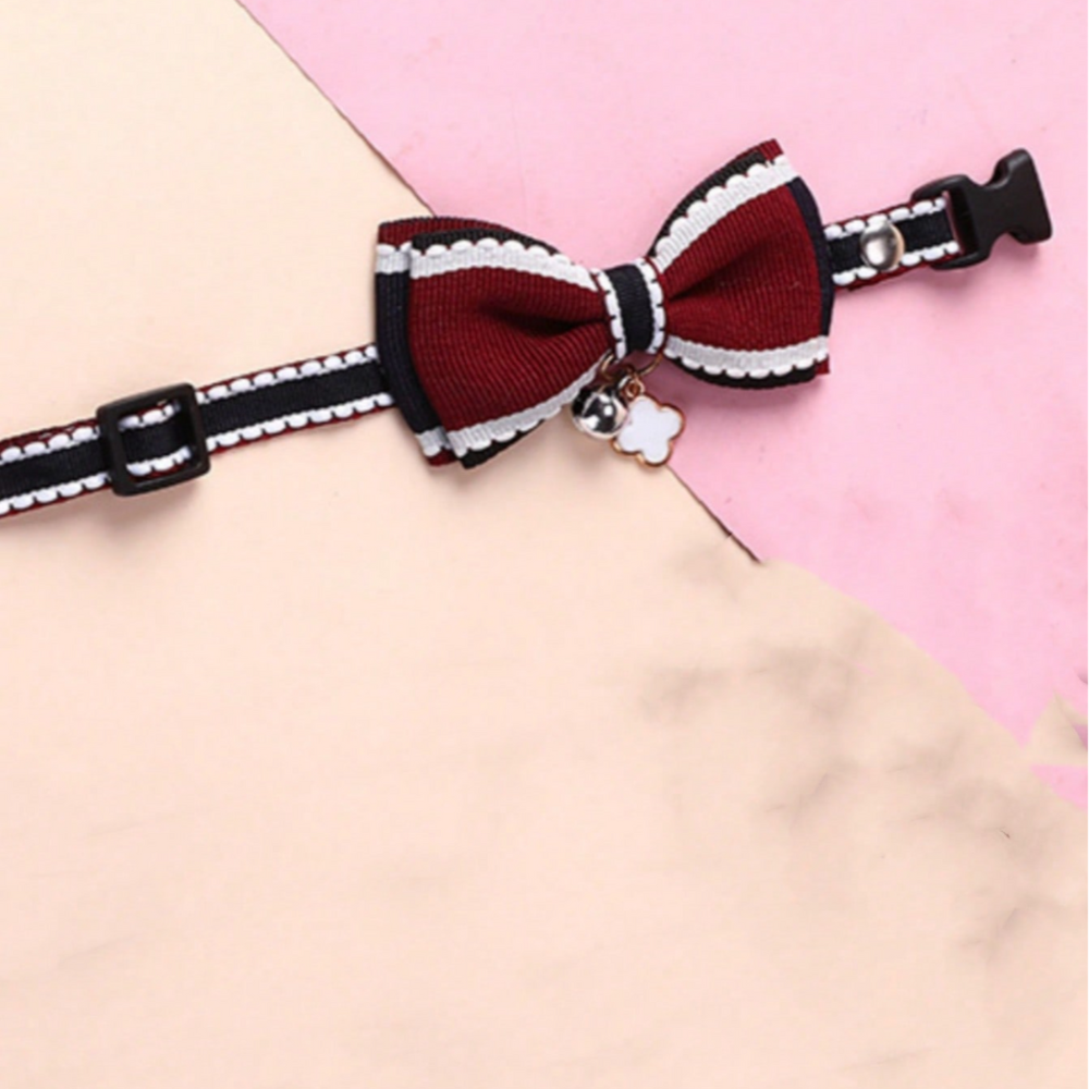 This elegant pet collar features a distinctive butterfly bowknot design in burgundy, black, and white with delicate scalloped trim.