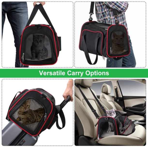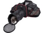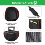 The black carrier with red trim offers multiple mesh ventilation panels and expandable compartments for enhanced comfort during travel.