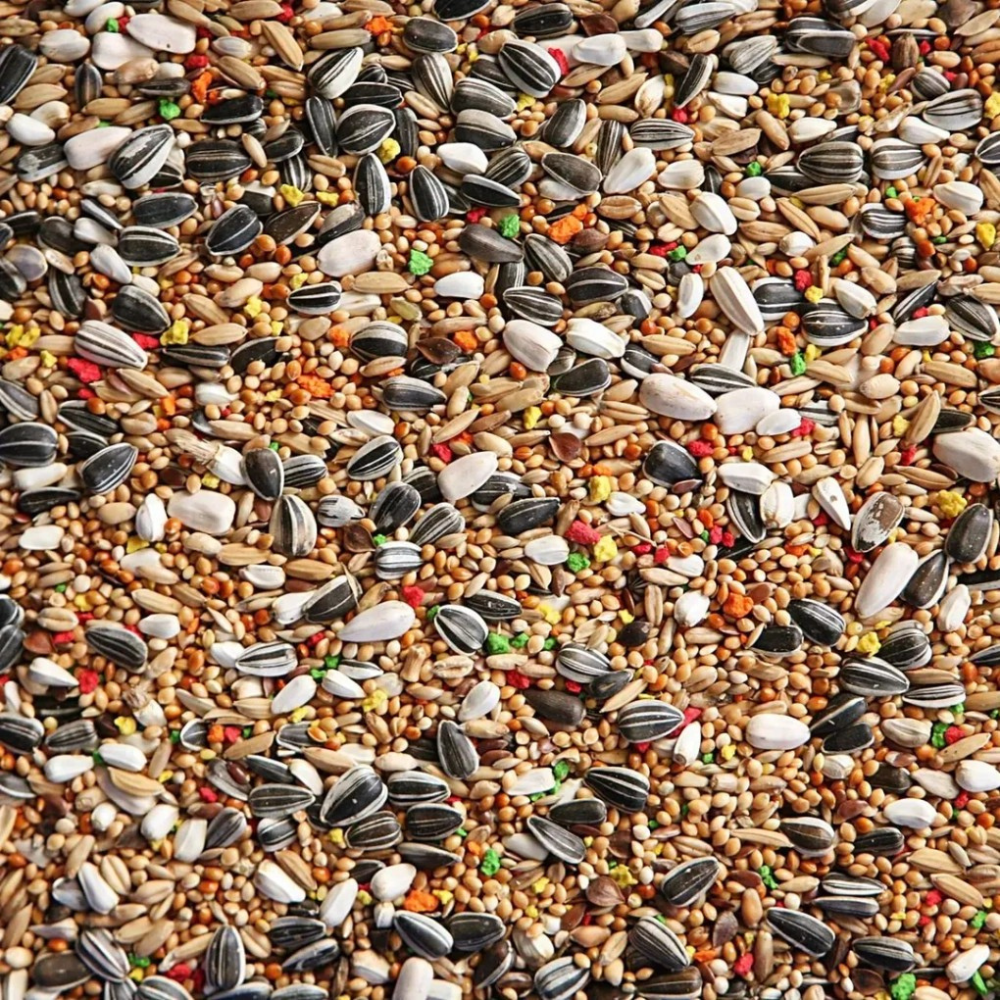 Contains premium-quality seeds, including White Sunflower, Safflower, and Buckwheat.