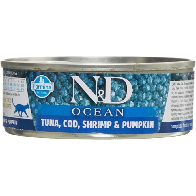 N&D Ocean Cat Tuna, Cod & Shrimp Recipe is formulated to meet the nutritional levels established by the AAFCO Cat Food Nutrient Profiles for maintenance.