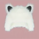 A charming plush hat featuring adorable cat ears, crafted from soft white polyester material. This fashionable accessory combines cute design elements with cozy comfort, making it perfect for casual wear and adding a playful touch to any outfit.