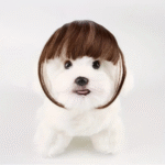 “This particular accessory features a short, brown wig with bangs, creating the illusion of a stylish human hairstyle on your pet. The image showcases a small white dog, likely a breed with fluffy fur, wearing the wig.
