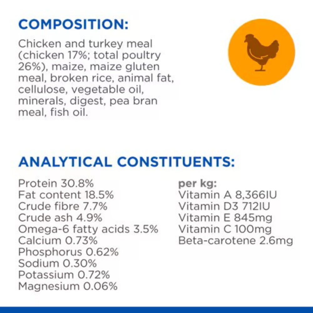Hills Science Plan Hairball & Perfect Coat Adult cat food with Chicken is specially formulated to provide cats with a complete and tasty nutrition to help avoid hairball formation while promoting a beautiful coat.