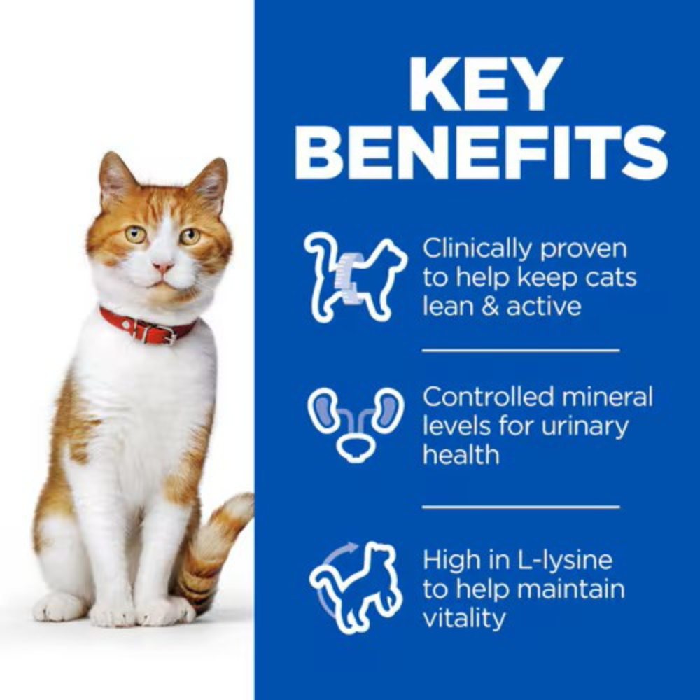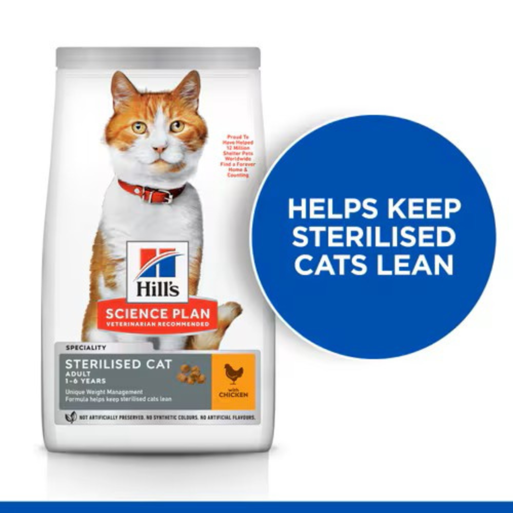 HILL’S SCIENCE PLAN Sterilized Cat Adult dry cat food has a unique Weight Management Formula to help keen sterilised cats lean. Made with high quality, easy to digest ingredients. With added L carnitine clinically proven to help cats stay lean & active Controlled levels of minerals for a healthy urinary system Low fat content, and high levels of L lysine, to help maintain vitality