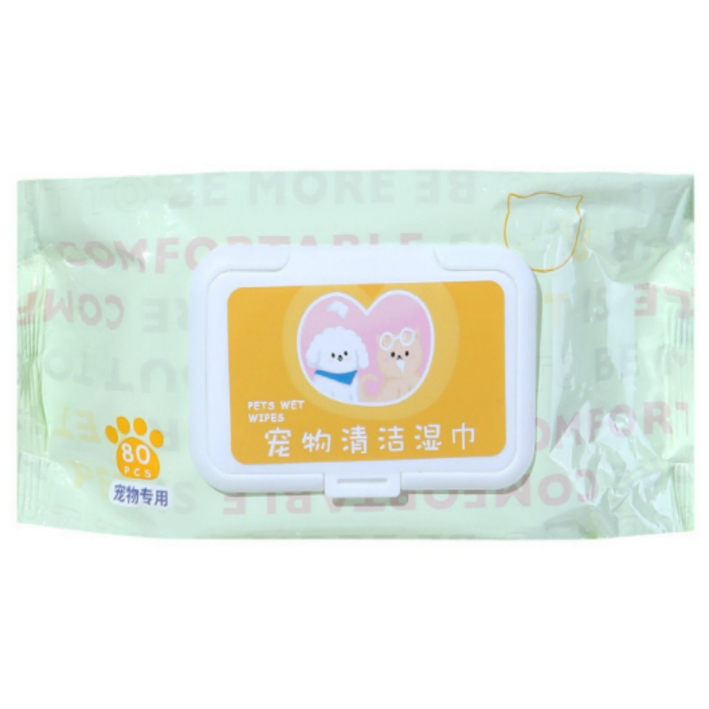 Modern non-woven pet care wipes featuring 80 sheets per pack, enriched with natural olive extracts for gentle and effective pet grooming. These soft wipes are designed for daily hygiene maintenance and grooming of pets, offering a convenient solution for keeping your pet clean and fresh.