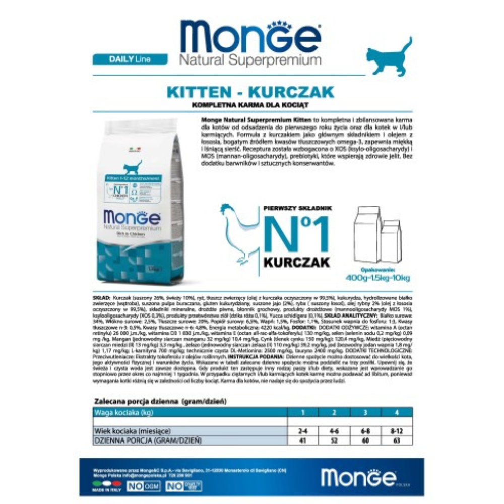 Monge Natural Superpremium Kitten Rich in Chicken is a complete food for cats from weaning to the end of the first year of age, and for pregnant and/or lactating cats.