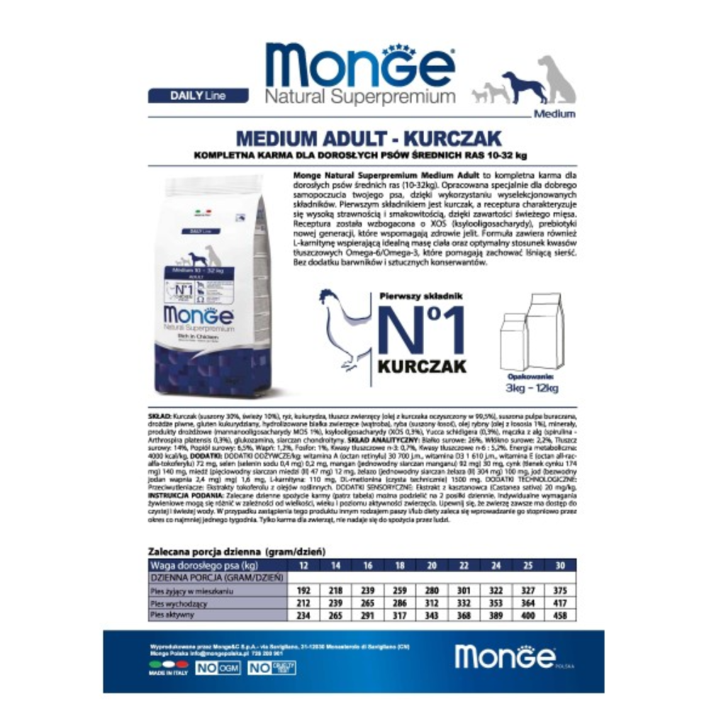 Monge Natural Superpremium Medium Adult based on chicken is a complete food for adult dogs of medium breeds, based on poultry meat and rice. It is easily digestible and supports proper intestinal peristalsis.