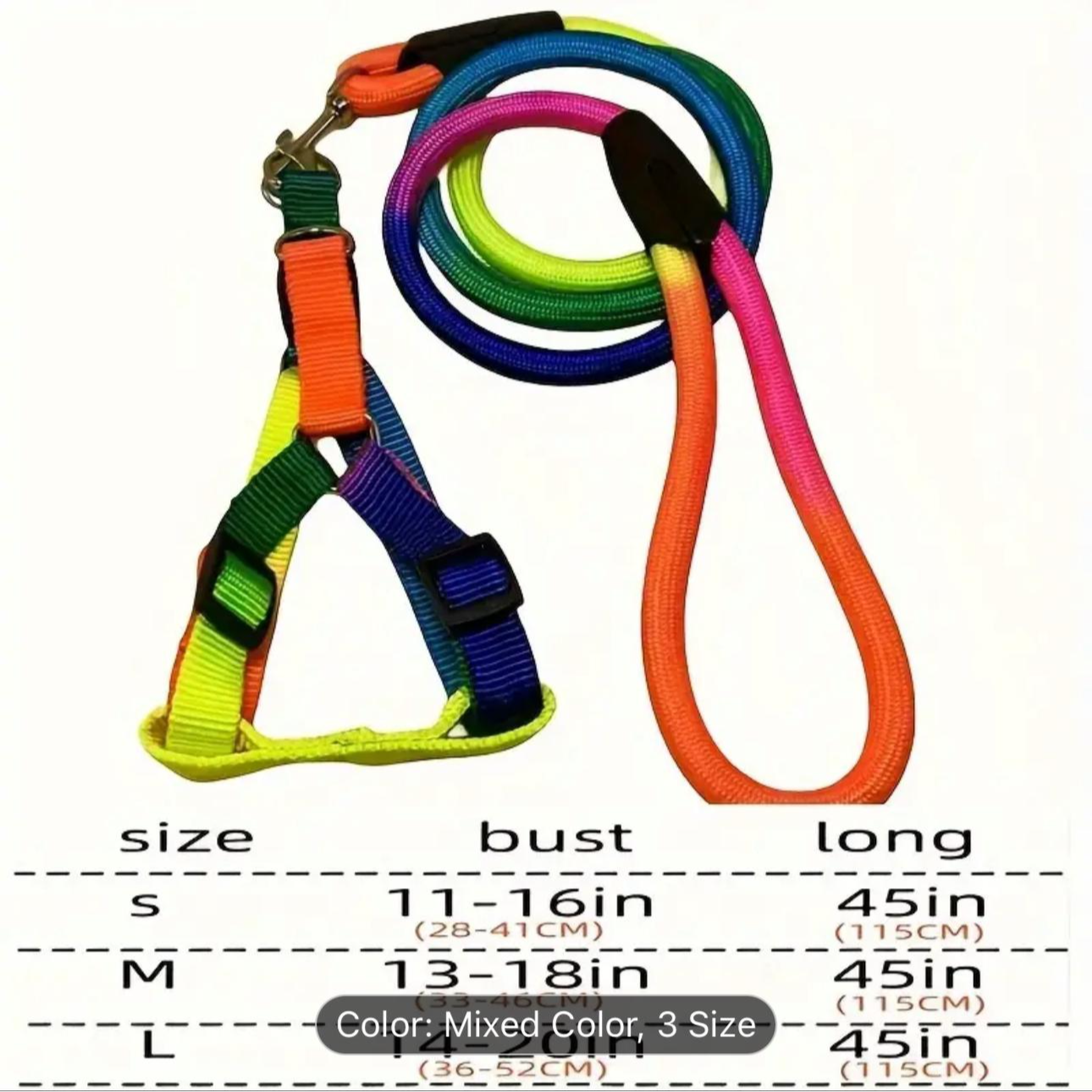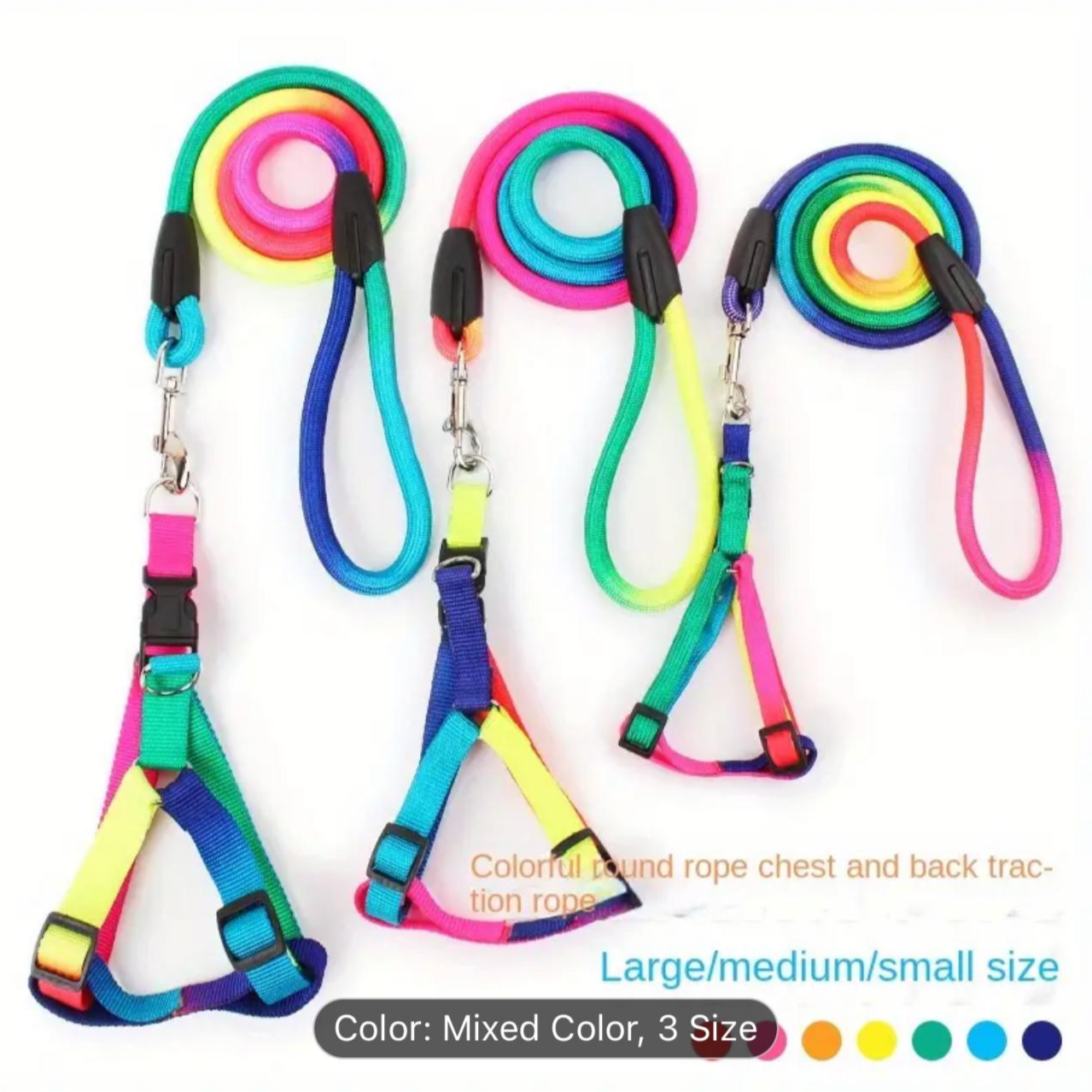 A vibrant rainbow-colored no-pull harness and leash set designed for small to medium pets. The set features an adjustable H-style harness with secure buckles and a matching colorful rope leash, providing comfortable control during walks and training sessions.