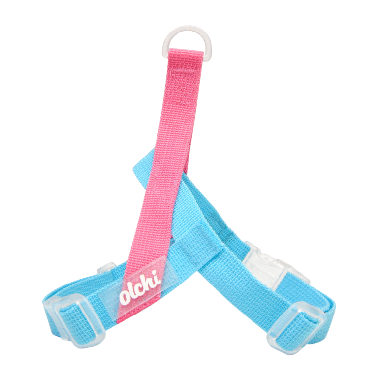 The Olchi Candy Ribbon Harness is a charming pet harness available in pink or sky blue featuring a delicate gingham pattern adorned with daisy flowers.