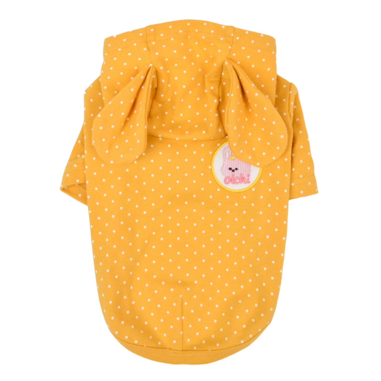 The Olchi Rabbit Polo Hoodie in yellow is a charming and preppy pet garment designed for dogs weight. This stylish hoodie features a delightful polka dot pattern in sunny yellow, with the signature Olchi brand embroidered rabbit logo on the chest.