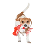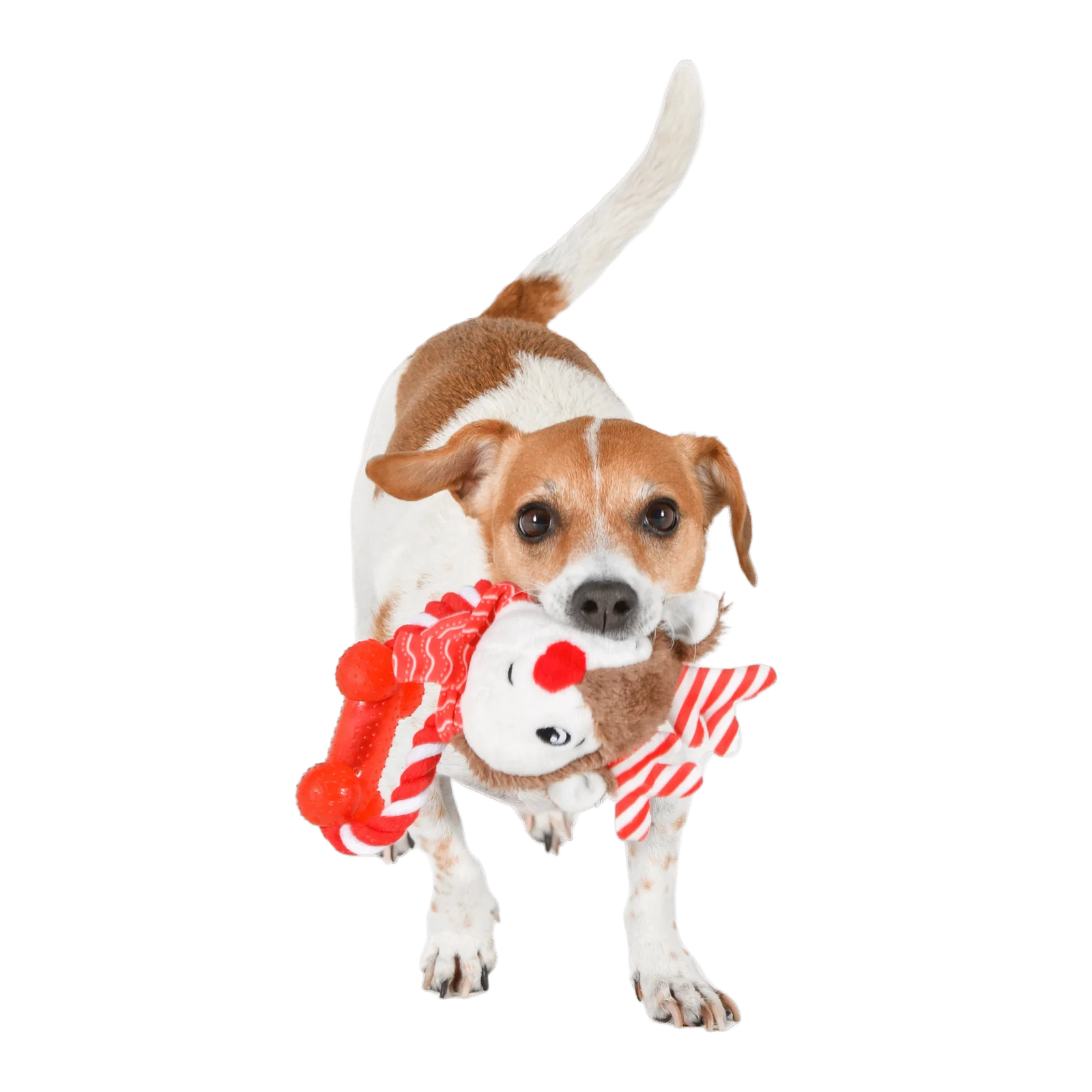 The toy incorporates both soft plush elements and textured surfaces, making it engaging for pets. The design features a brown and white color scheme with red accents, creating a festive holiday appearance. The attached bone accessory adds an interactive element for pets. While designed as a seasonal toy, it’s suitable for year-round play. Please supervise pets during playtime and inspect regularly for wear and tear.