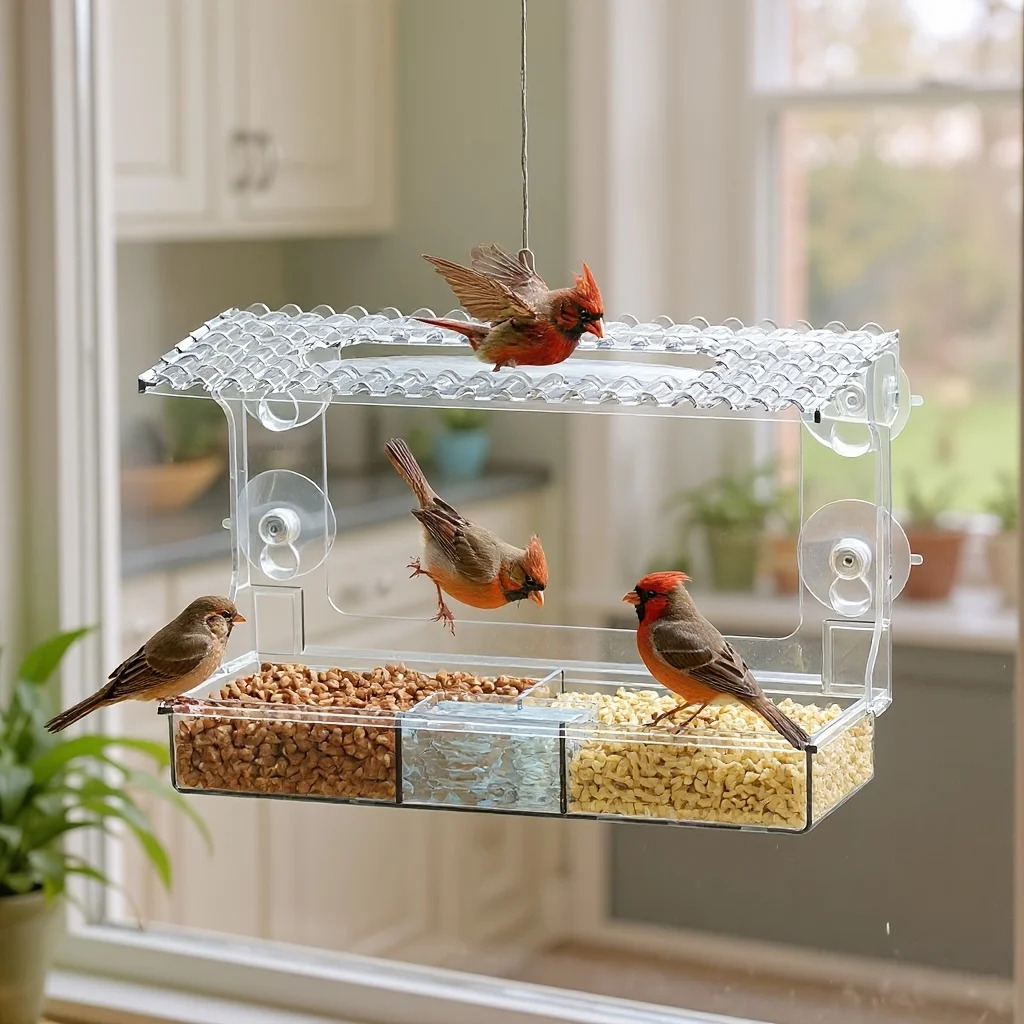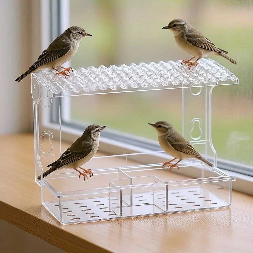 Transparent Powerful Suction Cup Cross-Border Pet Bird Cage Feeder Bird House No-Drill Window Birdhouse Outdoor Balcony Bird Feeder Plastic Bird Food Box Rainproof Feeder, Without Battery