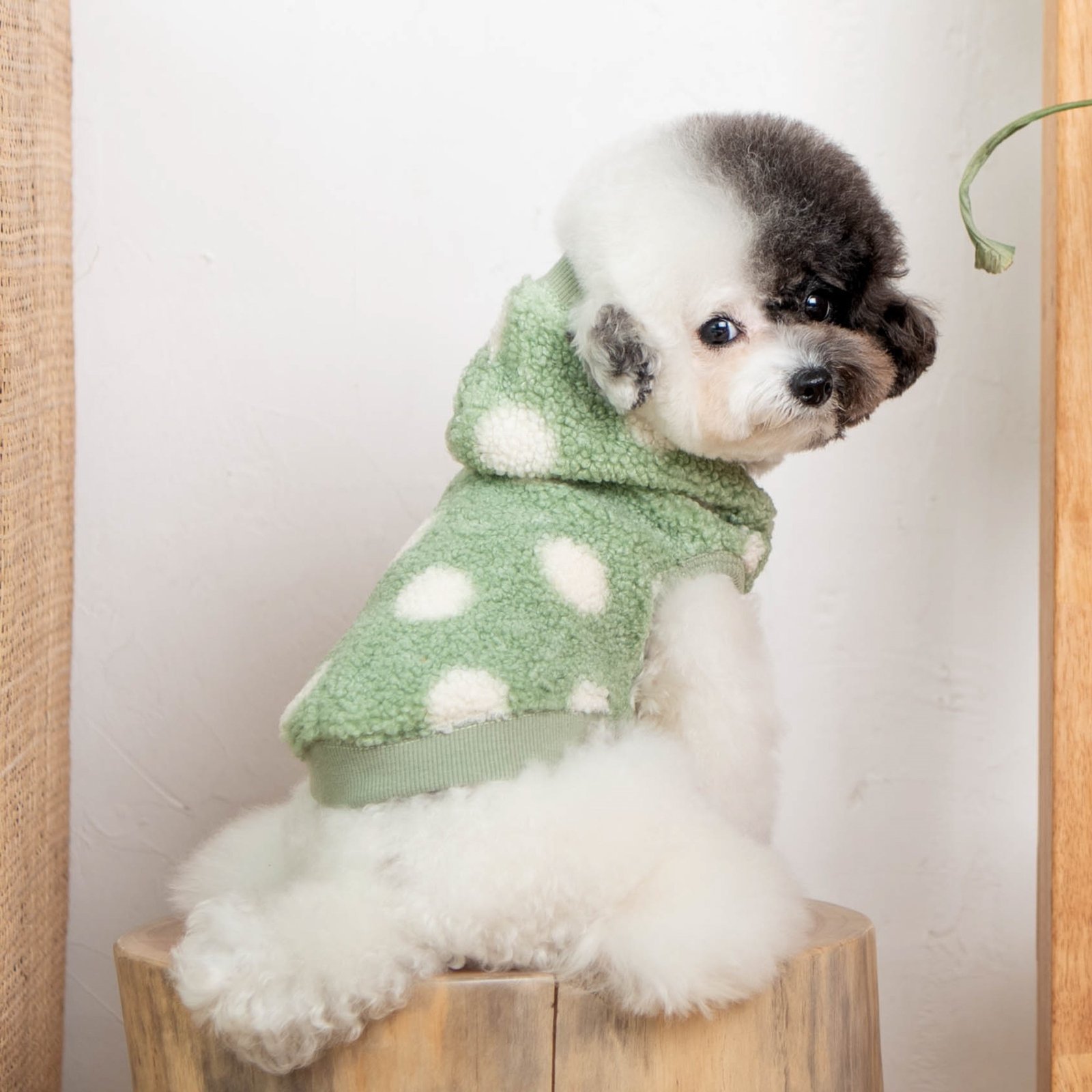 This fashionable pet hoodie is ideal for keeping your furry friend warm and stylish during cooler weather. The mint green color and playful polka dot pattern create a charming look, while the plush material provides comfort. The hood adds both style and functionality. The ribbed edges help keep the garment securely in place.