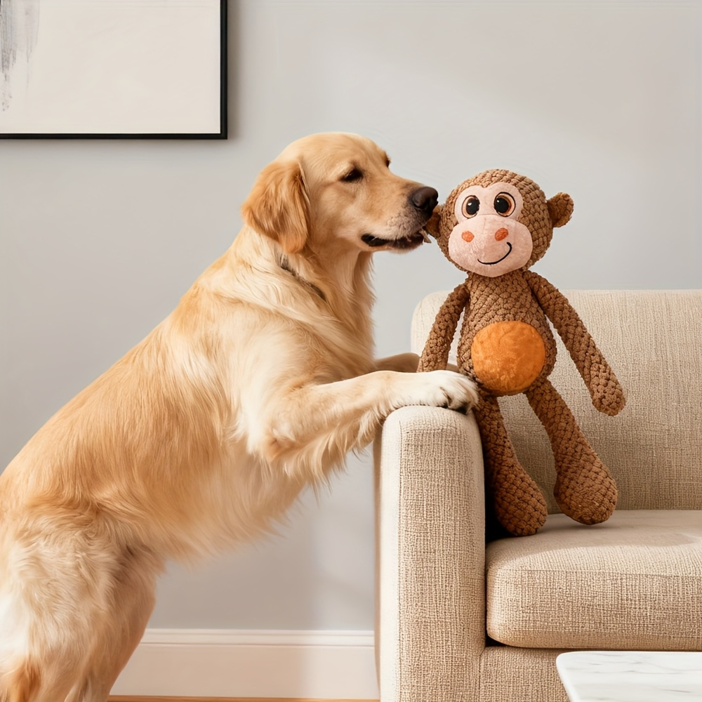 The plush squeaky dog toy monkey stands out with its appealing textured brown fabric and friendly facial features, including large expressive eyes and a smiling mouth. The toy’s long arms and legs make it easy for pets to grab, carry and shake during play. Its substantial size makes it an ideal companion for medium to large dogs, while still being appropriate for smaller pets who enjoy oversized toys. The combination of visual appeal, tactile interest, and interactive sound makes this monkey toy a versatile addition to your pet’s toy collection.