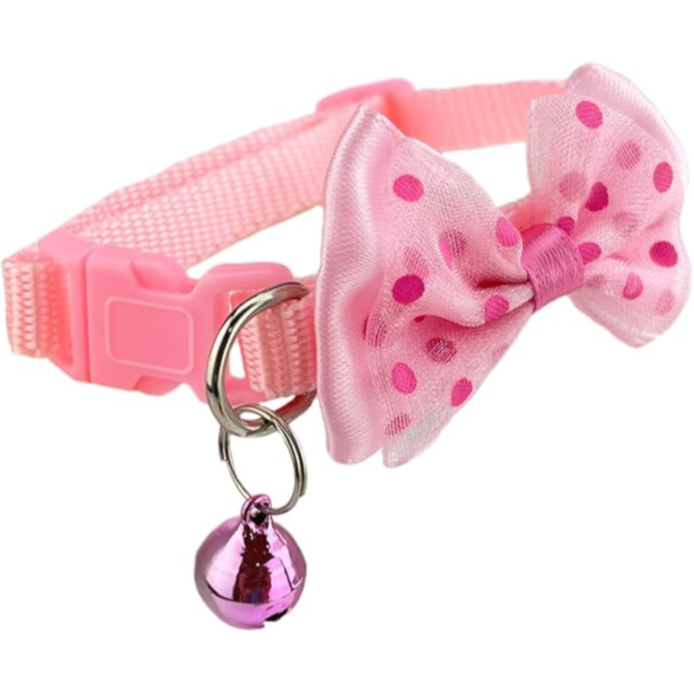 This charming pet collar features a delightful pink polka dot bow tie design with a coordinating bell.
