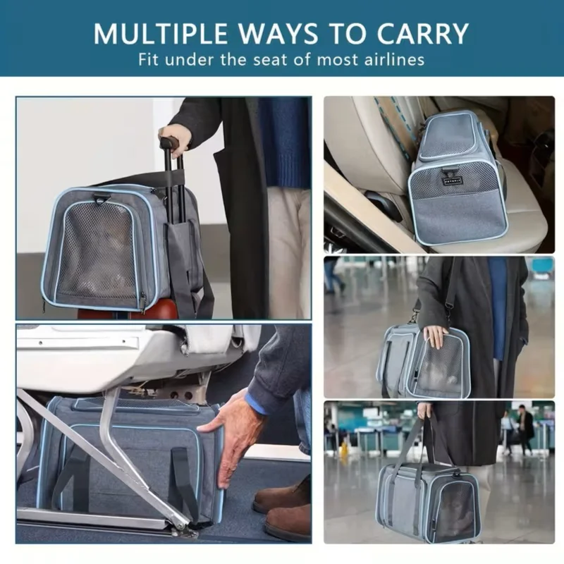 This expandable pet carrier features a unique design with multiple fold-out mesh panels that create extra space when opened. The gray exterior with light blue trim offers a modern look while providing excellent ventilation and visibility for your pet. A cozy cushioned base ensures comfort during travel.