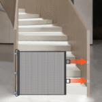 A retractable indoor pet safety barrier in sleek black, designed to secure stairs and create safe boundaries for pets.
