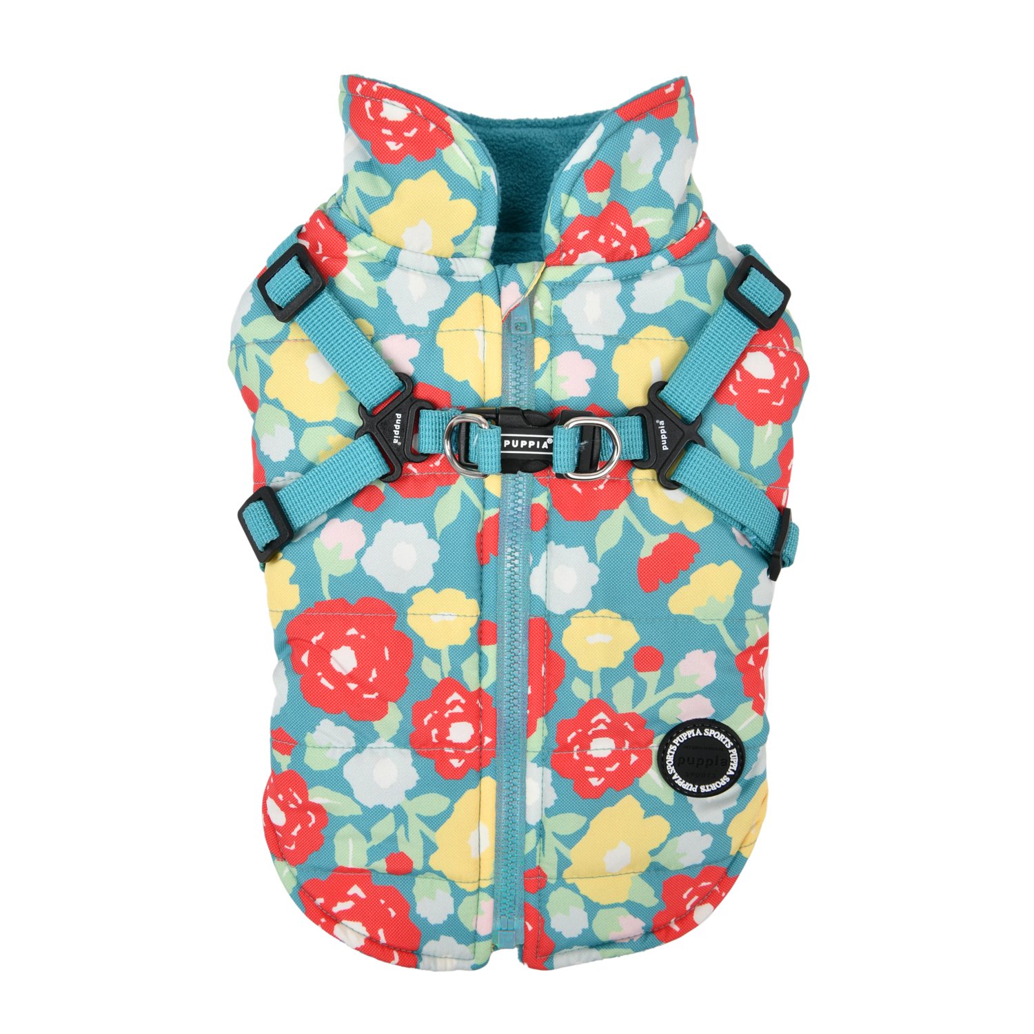 It features a back zipper and fits like a vest (the neck portion), with an added rubber Puppia tag for a snug fit. It’s available in brown and aqua in sizes ranging from small to double XL.