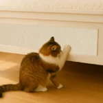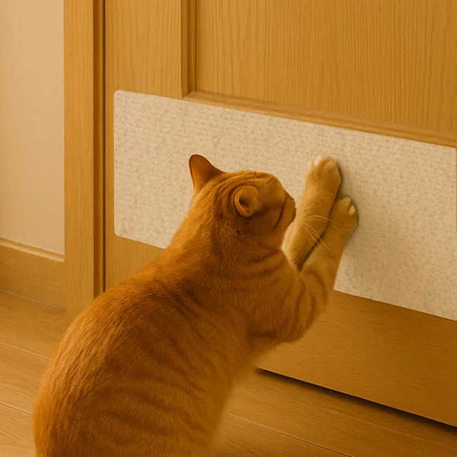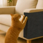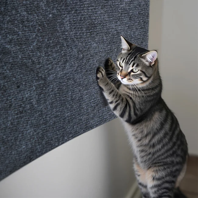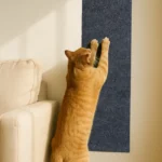 The Purfect Scratch Mat Protector comes in a neutral ivory color that complements most home decor. The mat can be applied to sofas, doors, cat furniture, and other surfaces commonly targeted by cats for scratching. Its self-adhesive backing ensures secure placement while the durable material withstands repeated scratching. The ability to trim the mat allows for customized protection of specific areas, making it a practical solution for preserving furniture while accommodating your cat’s natural scratching behavior.