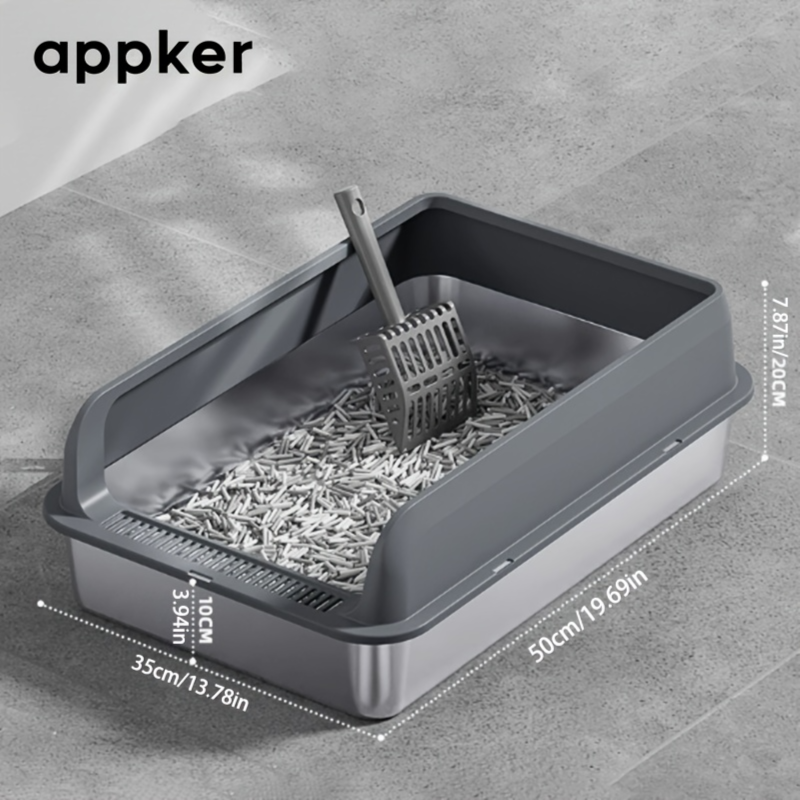 The Stainless Steel Litter Box with Raised Edges and Scooper offers a hygienic, durable, and spacious solution for cats.