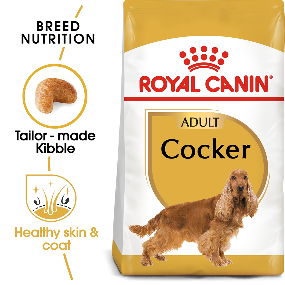 | Suitable for Cocker Spaniels over 12 months old, ROYAL CANIN Cocker Adult is specially formulated with all the nutritional needs of your dog in mind. To help maintain the health of your dog’s skin and coat, ROYAL CANIN Cocker Adult contains an exclusive complex of nutrients that helps to support the skin’s barrier role. Enriched with borage oil, vitamin A, and Omega-3 fatty acids (EPA and DHA), this formula helps to keep your dog’s coat nourished for optimal health. The Cocker Spaniel breed has a tendency to willingly exceed its daily intake allowance if given the chance. That’s why it’s important to help your dog manage its weight and body type. ROYAL CANIN Cocker Adult features an optimal formulation, including controlled fat contents, in order to allow a limited energy intake on a daily basis
