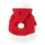 “This coat features a classic red and white color scheme with plush trim, a hood with pom-pom detail, and ‘Merry X-mas’ embroidery, perfect for dressing up your pet during Christmas celebrations.