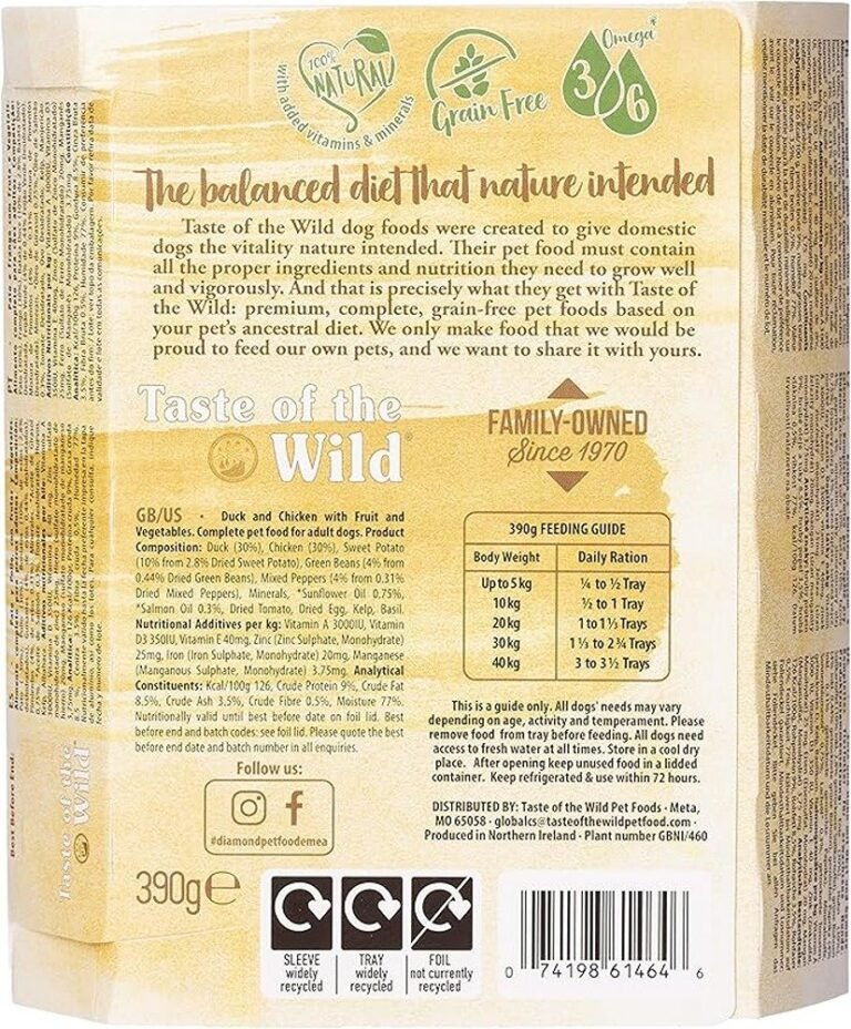 A great tasting complement to the dry Taste of the Wild formulas, the Pacific Stream Canine Formula with Smoked Salmon will satisfy your pet’s taste for wet food. This complete and balanced formula can also be your pet’s sole diet. Contains salmon and smoked salmon, perfect sources of omega-3 fatty acids. Sweet potatoes, blueberries and raspberries are great sources of natural antioxidants for a healthy lifestyle.