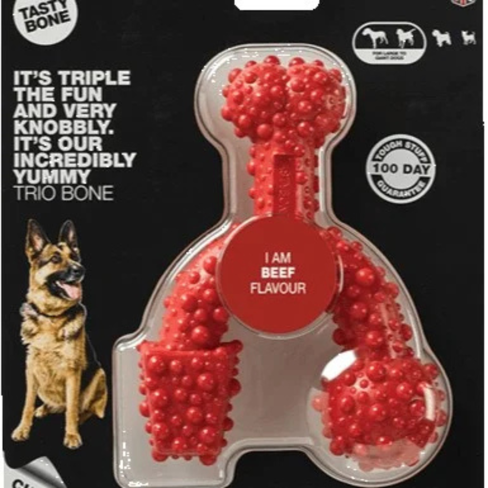 “It’s triple the fun and very knobbly. It’s our incredibly yummy Trio Bone. Like all of our nylon chews, this TastyBone product has been tested on the most vigorous of chewers. Made from 100% virgin nylon, it is guaranteed to last. Uniquely infused with irresistible flavours right through to the core, your dog will never get bored, as the flavour will last for the lifetime of the bone. With every bite your dog’s gums and teeth become stronger and healthier, protecting against infections, tooth loss and vet fees. This bone has a lip smackingly delicious beef flavour and is designed for toy, small, medium, and large dogs.