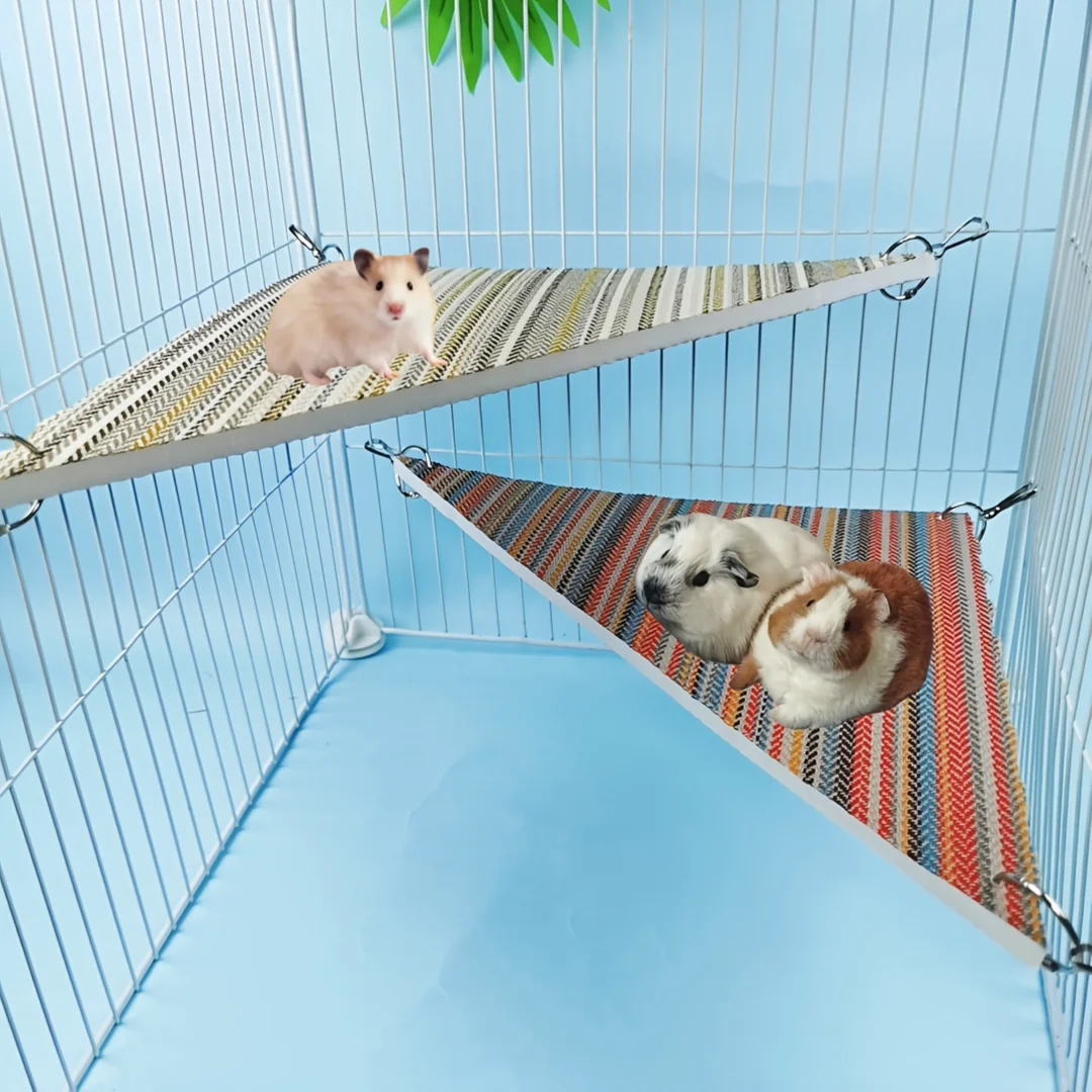 A versatile triangle-shaped hammock designed for small pets and birds, featuring a durable fabric construction with an attractive pattern. This hanging bed provides a cozy resting spot that can be easily attached to most pet cages, offering both comfort and entertainment for various small animals.