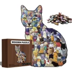 This artistic wooden puzzle features a striking cat silhouette composed of numerous colorful cat faces, creating a unique and challenging jigsaw experience. The irregular kitten-shaped pieces combine to form a larger feline mosaic design, offering both visual appeal and engaging entertainment.