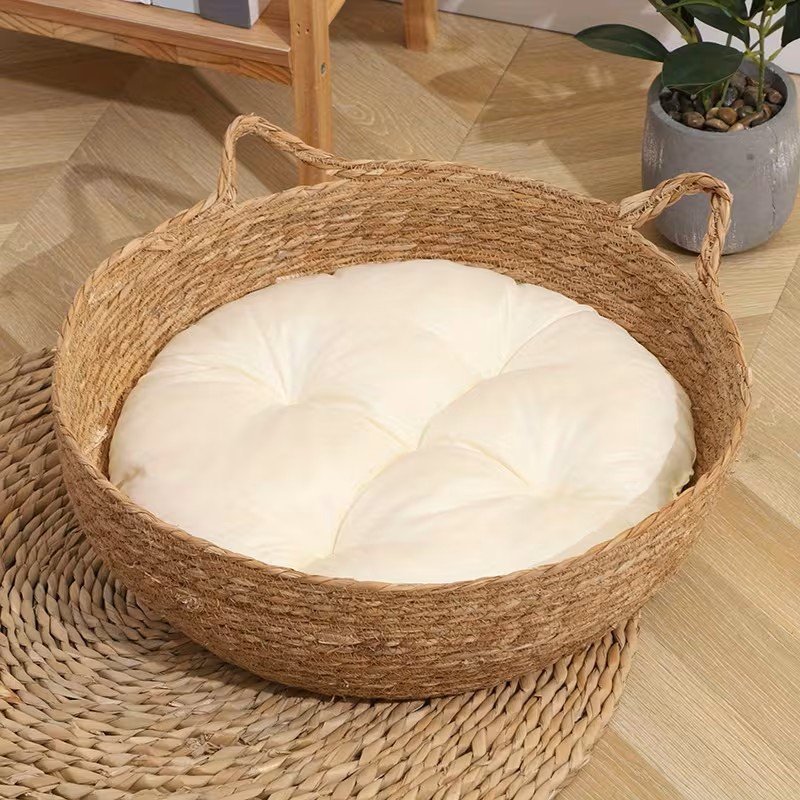 This handwoven bed is designed for indoor cats, providing a warm and comfortable resting spot with a neutral color that blends seamlessly with any decor.