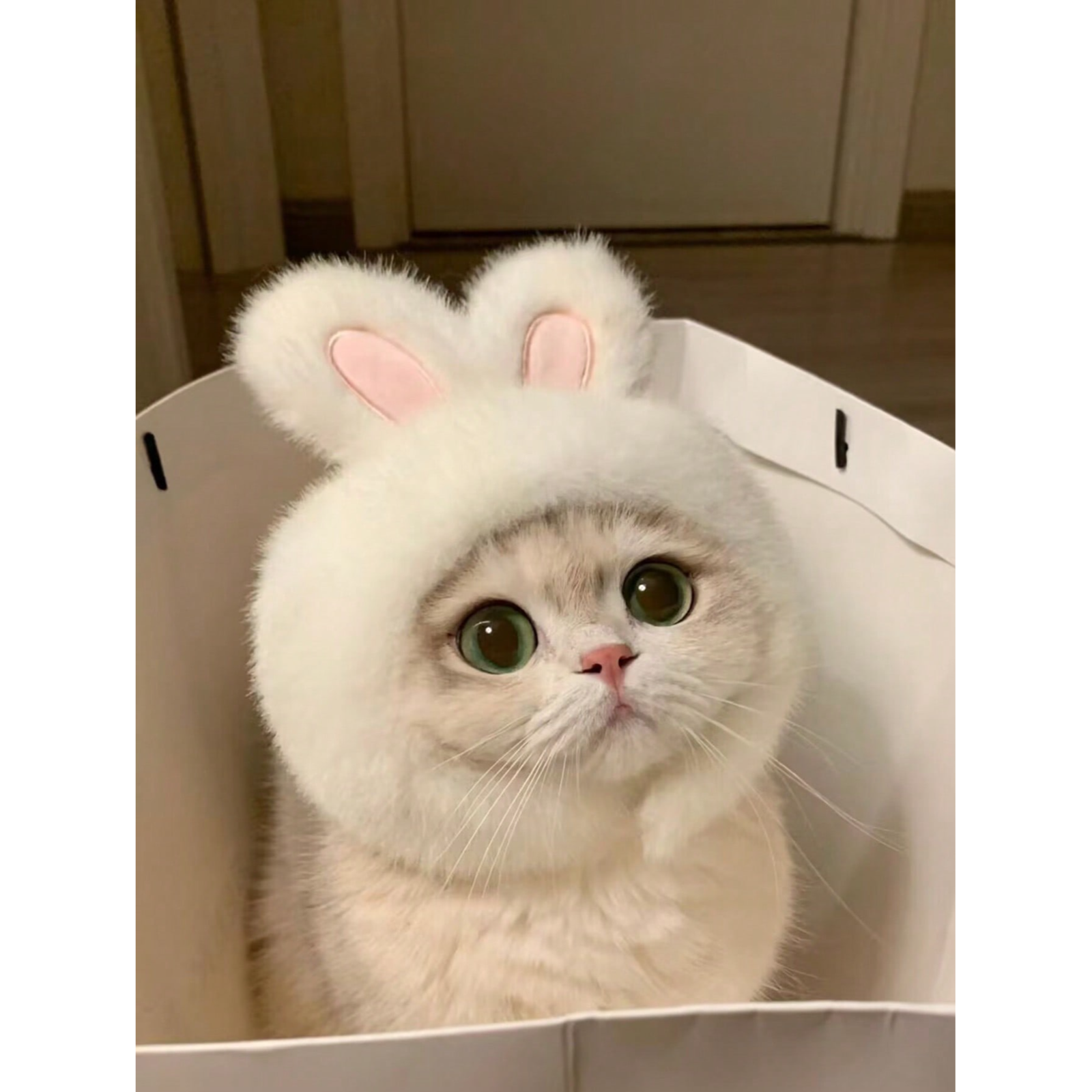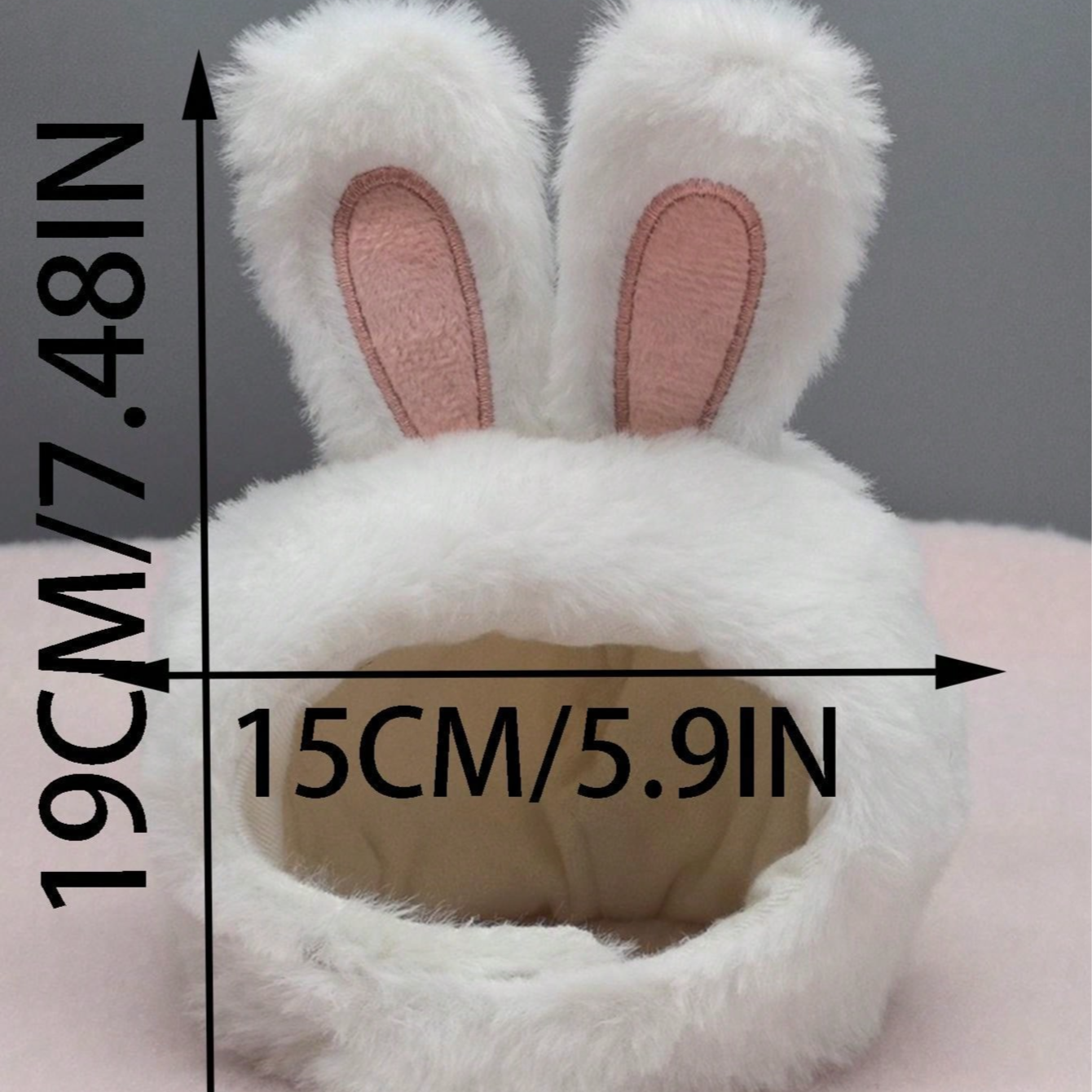 This adorable white rabbit-themed pet hat features soft, plush material with fluffy bunny ears adorned with pink inner accents.