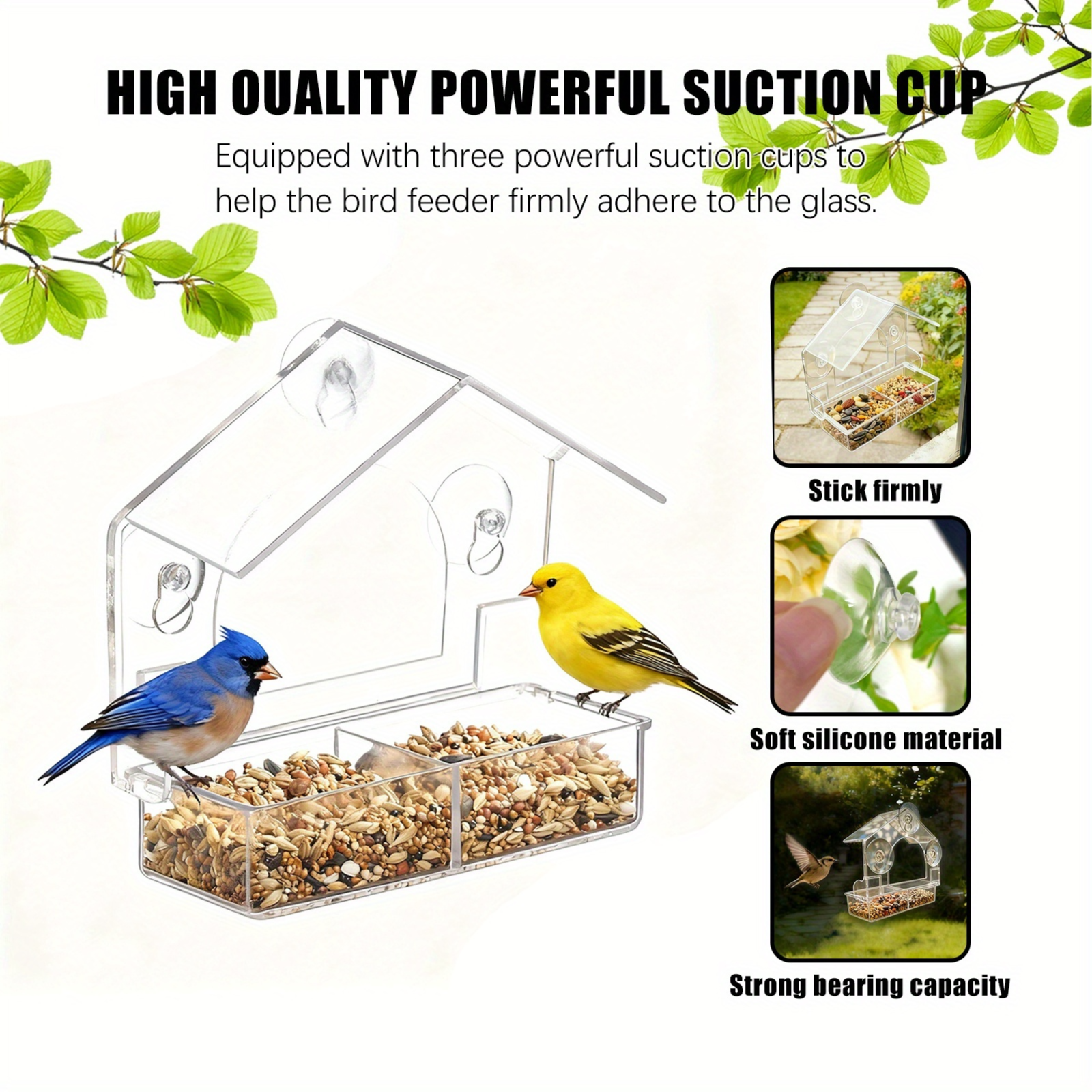 This window-mounted bird feeder features transparent acrylic construction with strong suction cups for secure attachment. The house-shaped design includes a covered feeding area and a large capacity tray for seeds allowing for clear observation of visiting birds while protecting feed from the elements.